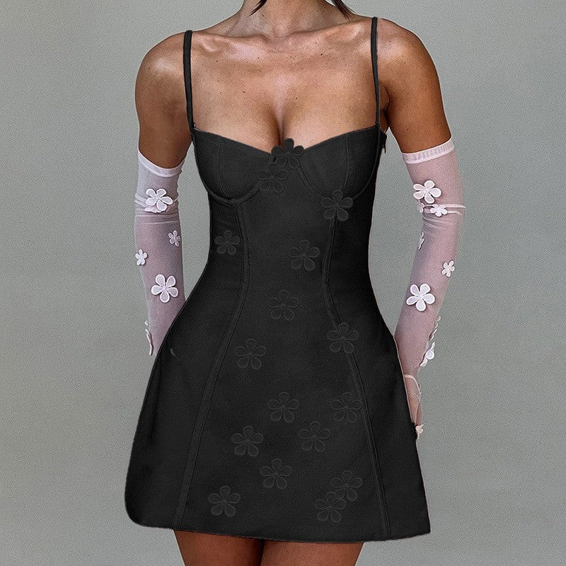 Denna korta klänning med blommönster och subtila axelband är ett utmärkt val för dig som söker mjuk femininitet och modern stil.